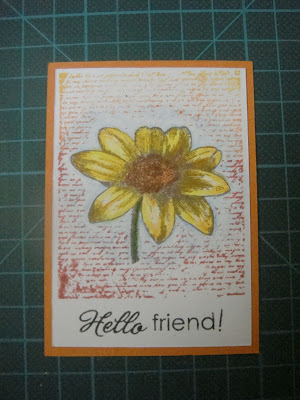 Bikin ATC ini butuh ketelatenan. Aku menggunakan teknik masking agar image bunganya seperti berada di depan background scriptnya. Untuk kertas, aku hanya menggunakan kertas lokal biasa dan coloringnya pakai Faber Castell watercolor pencil. Untuk ink aku menggunakan Mango Madness Versamagic, Orange Artnic, Ladi Bug dan Rhubarb Stalk Memento. Stamp Sunflower n sentiment dari Hero Arts dan stamp script dari Kaiser Craft.