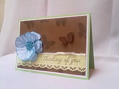 Kartunya dibuat dengan mengambil salah satu color combonya, warna hijau-coklat-biru dan putih. Walaupun ga menang, tapi seneng bisa ikut. Oya, stamp bunga dan sentimen dari Hero Arts, stamp kupu-kupu dari Studio G, paper pattern dari DCWV dan milimeter block untuk bunganya, punch dari JEF punch. Untuk bunganya aku buat bertumpuk 3, tebalkan dengan glitter pen biru dan kasih gem di putik.
